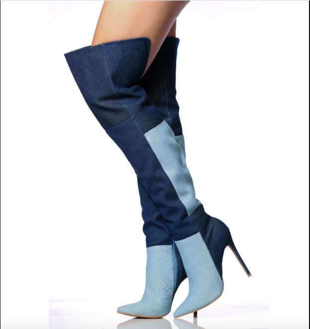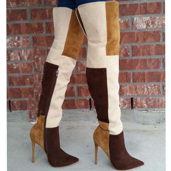 Patchwork Color Block Denim Stiletto High Heel Pointed Toe Over the Knee Long Boots