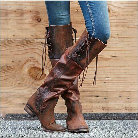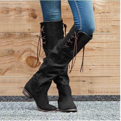 LEATHER LACE UP LOW HEEL KNEE HIGH