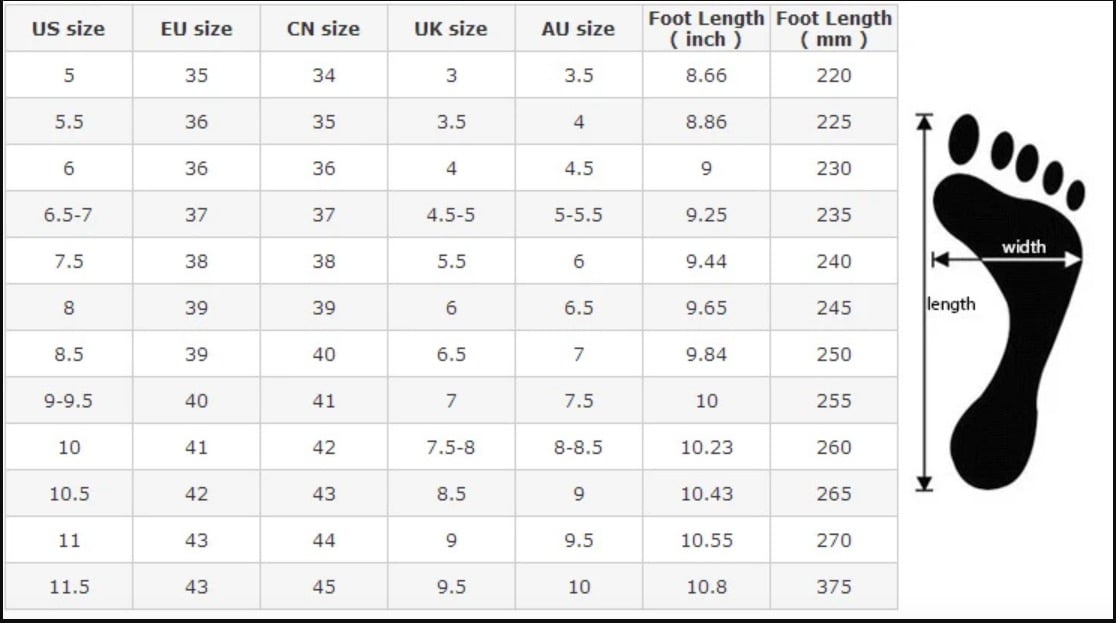 Size: US 5.5 | EU 36 | UK 3.5 | CN 35, US 6 | EU 36 2/3 | UK 4 | CN 36, US 6.5-7 | EU 37 1/3 | UK 4.5 | CN 37, US 7.5 | EU 38 | UK 5 | CN 38, US 8 | EU 38 2/3 | UK 5.5 | CN 39, US 8.5 | EU 39 1/3 | UK 6 | CN 40, US 9-9.5 | EU 40 | UK 6.5 | CN 41, US 10 | EU 40 2/3 | UK 7 | CN 42, US 10.5 | EU 41 1/3 | UK 7.5 | CN 43