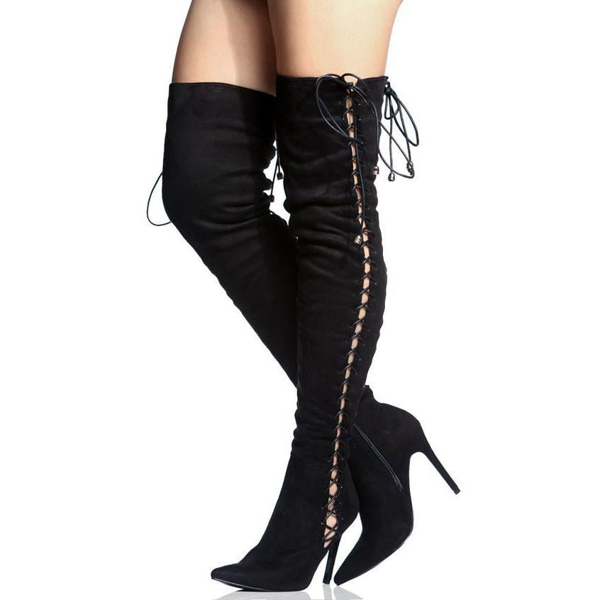 SIDE STRAPS LACE UP SUEDE STILETTO HEEL POINTED TOE OVER THE KNEE LONG BOOTS