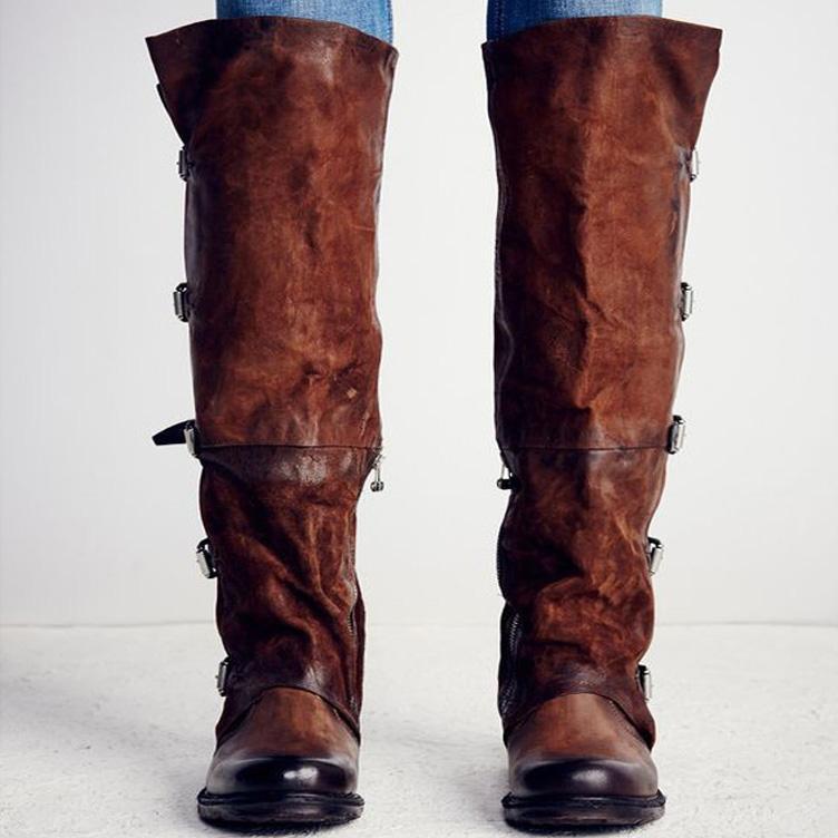 LEATHER BUCKLE LOW HEEL KNEE HIGH BOOTS