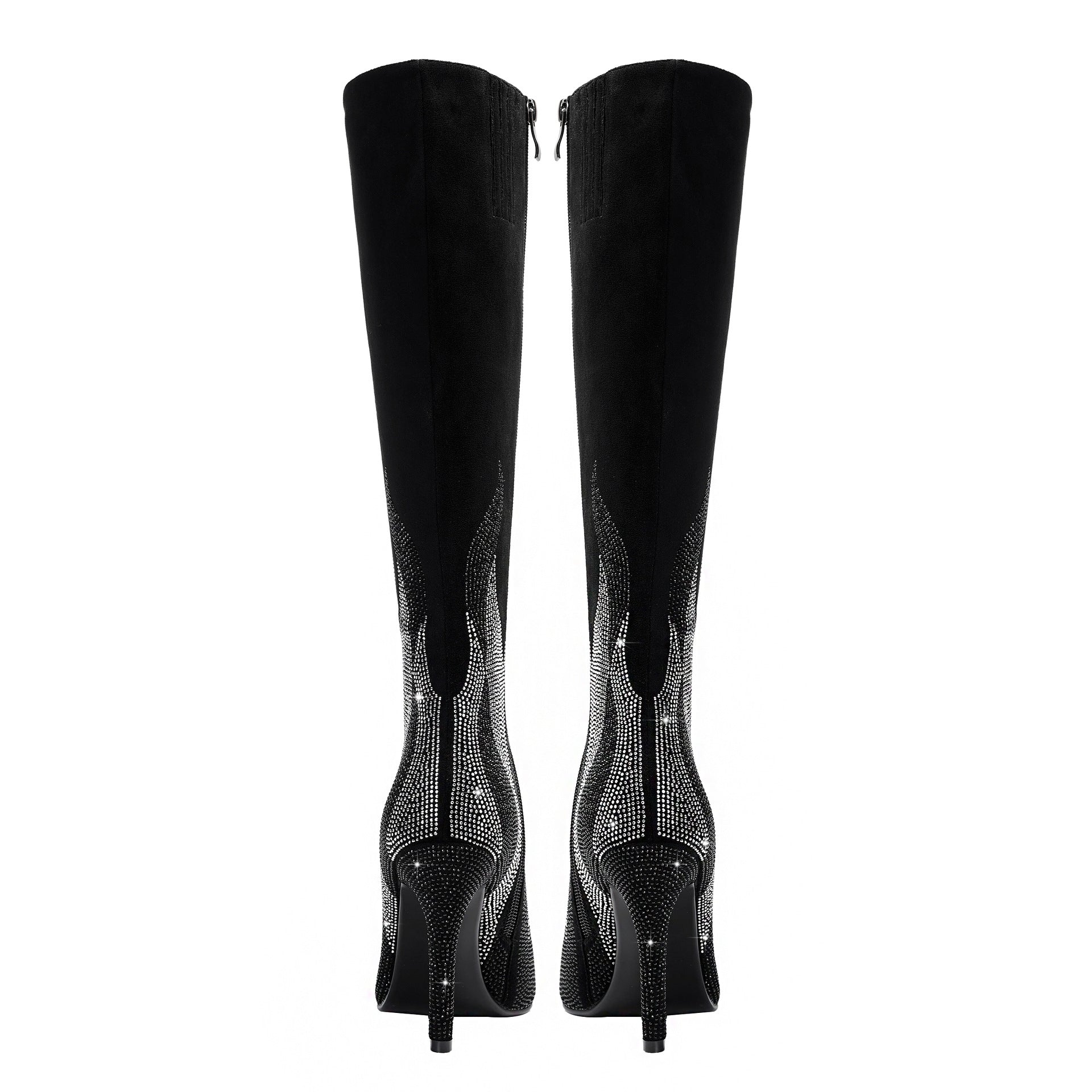 Elevate your style with our stunning Colorful Rhinestone Embellished Pointed Toe Stiletto Knee-High Boots. Crafted with precision and finesse, these boots feature a sleek pointed toe design adorned with shimmering rhinestones, adding a touch of glamour to any ensemble. The slim high heel elongates your silhouette, while the snug fit and knee-high length offer both elegance and comfort. Perfect for making a statement at parties, events, or any special occasion, these boots are a must-have for the fashion-forward individual