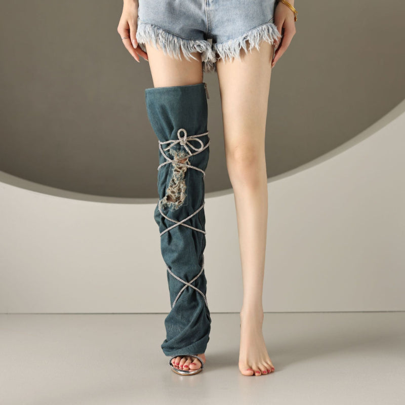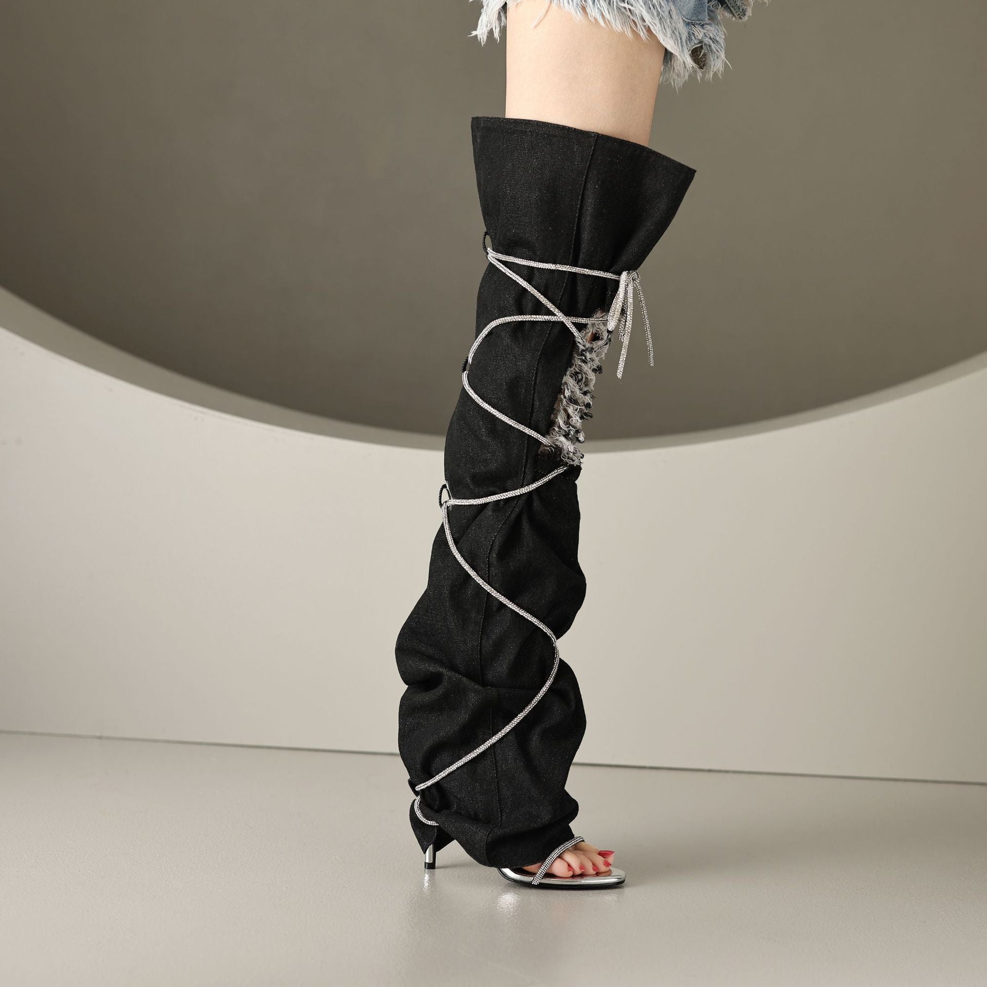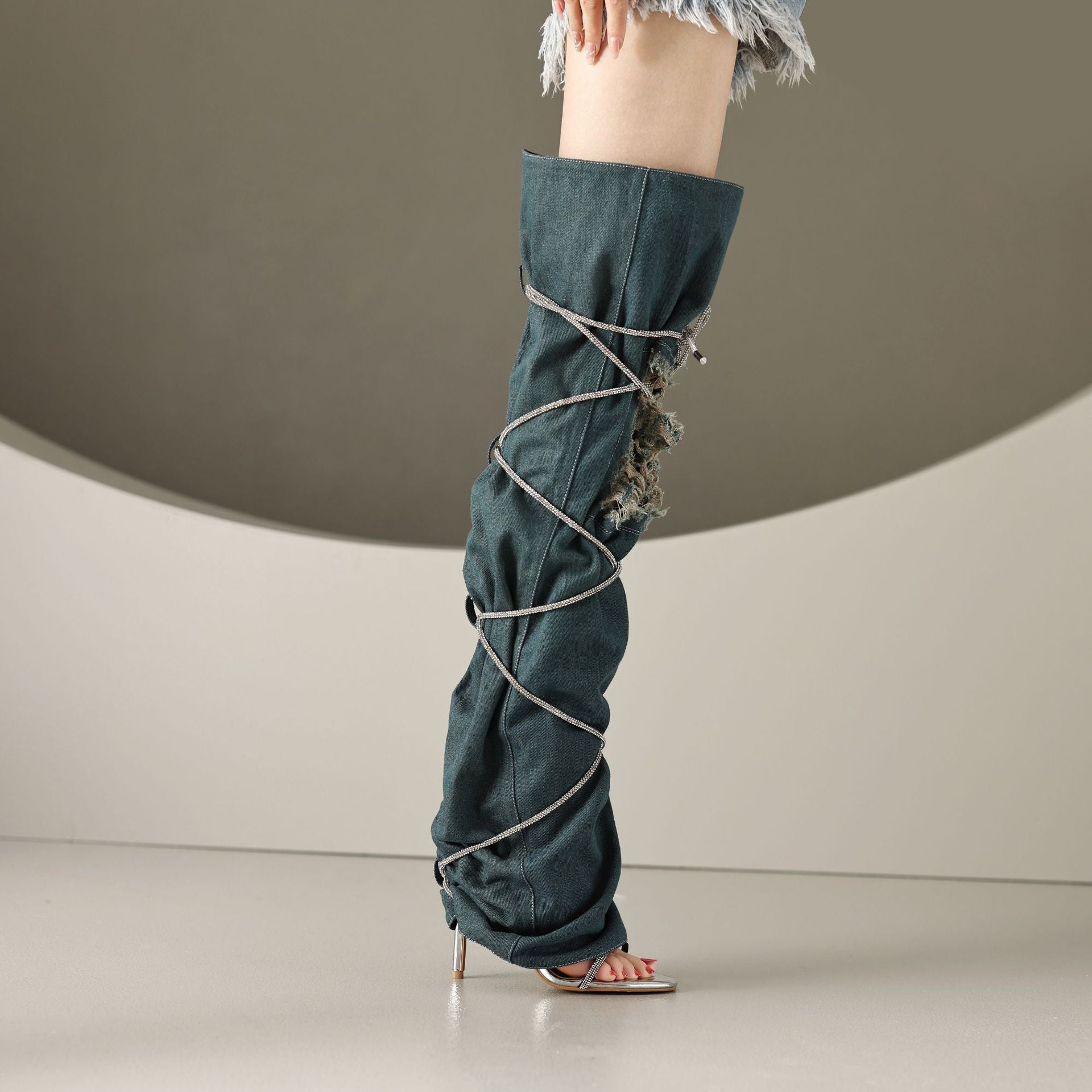 Elevate your Western chic with these Rhinestone-Studded Cowboy Distressed Cross-Laced Stiletto Boots. Crafted for the bold fashionista, these boots feature a distressed denim construction adorned with shimmering rhinestones for a touch of glam. The crisscross lacing adds a rebellious edge, while the slender stiletto heel elongates the legs for a confident stride. Whether you're hitting the streets or the dance floor, these boots are sure to make a statement