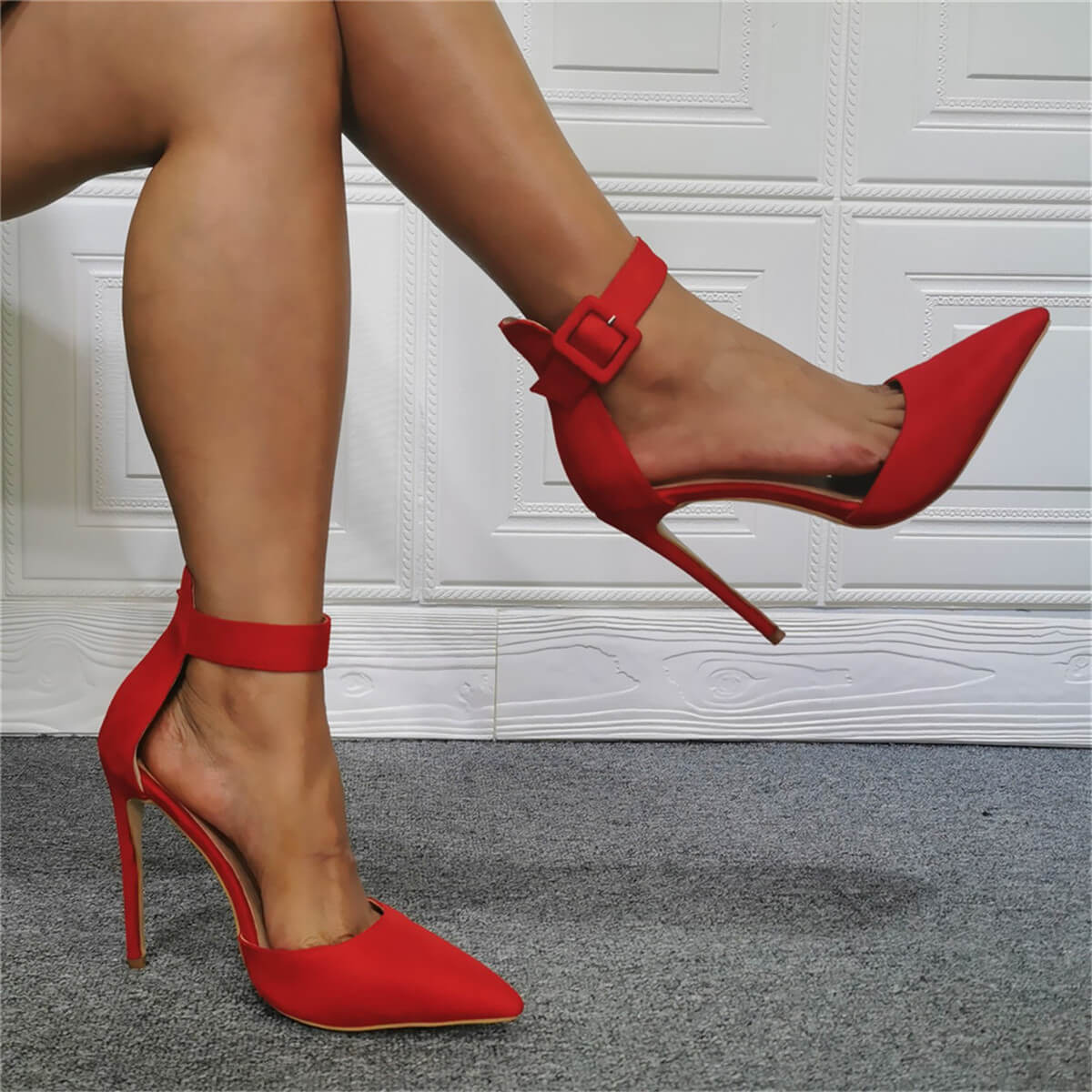 Pattern Type: Red, Suede, Point Toe, Ankle Buckle High Heels
