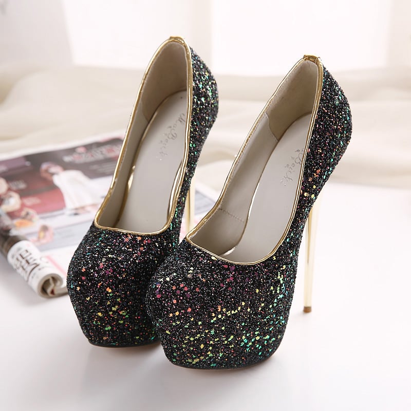 Glitter Rounded-Toe Platform High Heel Stilettos-Black