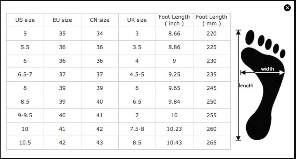 Size: US 5.5 | EU 36 | UK 3.5 | CN 35, US 6 | EU 36 2/3 | UK 4 | CN 36, US 6.5-7 | EU 37 1/3 | UK 4.5 | CN 37, US 7.5 | EU 38 | UK 5 | CN 38, US 8 | EU 38 2/3 | UK 5.5 | CN 39, US 8.5 | EU 39 1/3 | UK 6 | CN 40, US 9-9.5 | EU 40 | UK 6.5 | CN 41, US 10 | EU 40 2/3 | UK 7 | CN 42, US 10.5 | EU 41 1/3 | UK 7.5 | CN 43