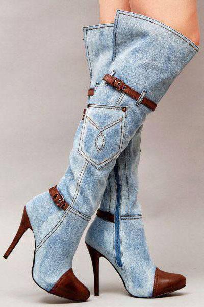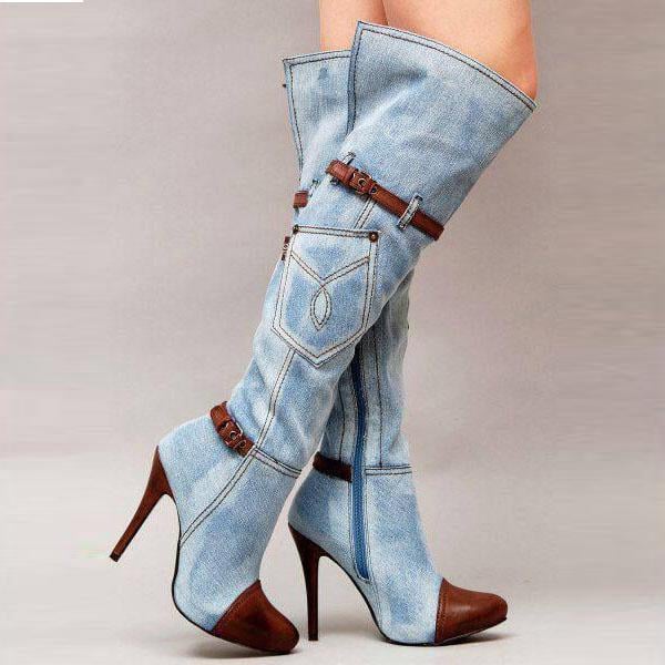 DENIM POINTED TOE PATCHWORK STILETTO HIGH HEELS KNEE-LENGTH LONG BOOTS