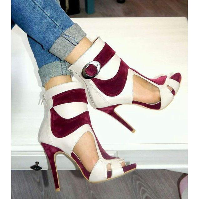 COLOR BLOCK PEEP TOE CUT OUT BACK ZIPPER STILETTO HIGH HEELS SHORT BOOT SANDALS