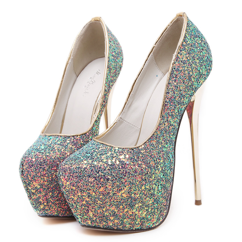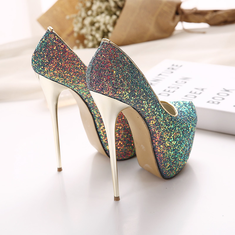 Glitter Rounded-Toe Platform High Heel Stilettos-Bue