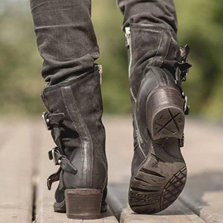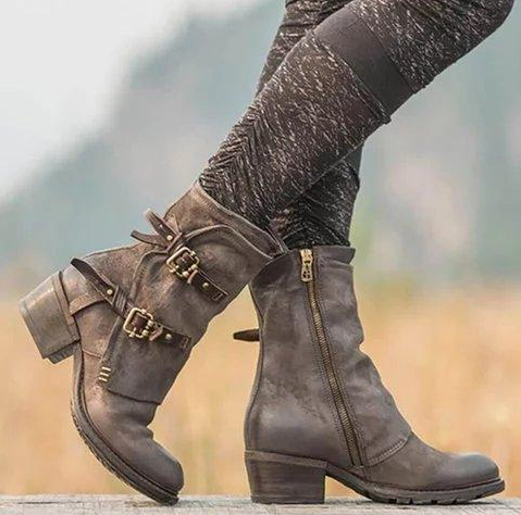Leather Buckle Zipper Chunky Heel Ankle Boots