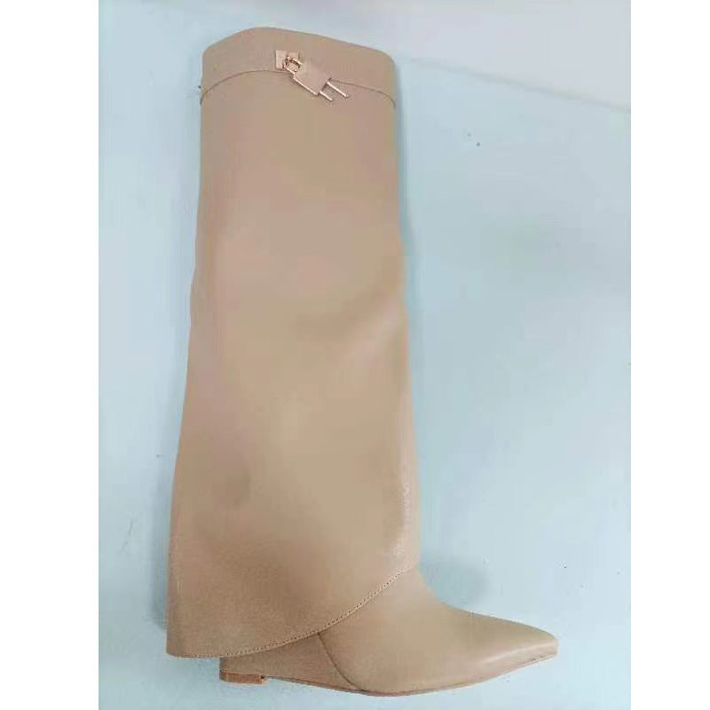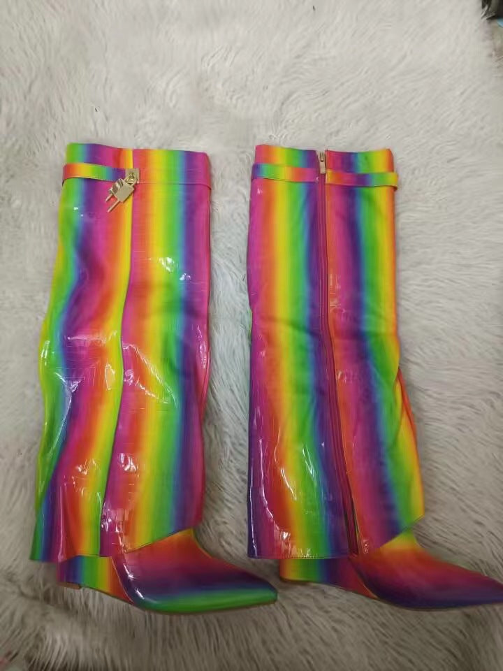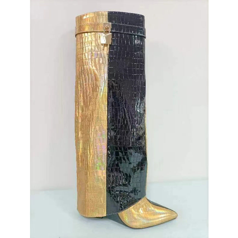 Elevate your style with these unique Circular-Headed Large Cylinder Stone-Patterned Shark Buckle Knee-Length Pants Boots. Crafted with attention to detail, these boots feature a distinctive circular-headed design and are adorned with stone-patterned shark buckles for added flair. The knee-length pants design offers versatility and pairs effortlessly with a variety of outfits. Step out in confidence and make a statement with these bold and fashion-forward boots